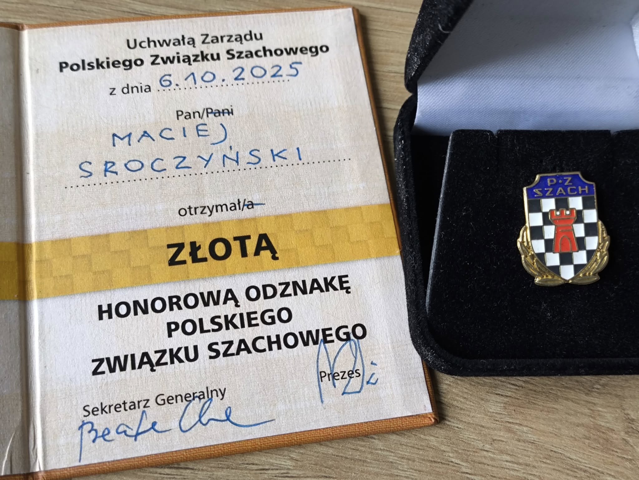 Macieja Sroczyńskiego znam ponad rok. Przez ten czas dał się poznać trenując szachy z juniorami, jako bardzo dobry fachowiec. Wiedza w połączeniu z doświadczeniem powodują, że młodzi szachiści wychodzący spod Jego ręki odnoszą sukcesy na arenie ogólnopolskiej, a nawet poza granicami kraju. Posiada zdolność oceny czy młody szachista ma talent i czy praca z nim przyniesie wymierne efekty. Zawsze zaangażowany w to co robi. Zależy Mu aby szachy kaliskie rosły w siłę. Wypracowany autorytet powoduje, że juniorzy na wykładach prowadzonych przez Macieja, słuchają go z zapartym tchem. Rozmawia na zajęciach z dziećmi ich językiem, przez co przekazywana wiedza staje się dla młodych szachistów dużo łatwiejsza do zrozumienia. Jego obecność na turniejach jako trenera, mobilizuje dzieci do lepszej, dokładniejszej gry. Potrafi znakomicie przygotować do partii turniejowych. Umiejętność doboru odpowiedniego wariantu zawsze procentuje osiągnięciem lepszego wyniku. Można powiedzieć że jest gwarantem sukcesu. Mam wrażenie że dla szachów jest zdolny do dużych poświęceń. A prywatnie bardzo fajny kolega. Lubię spędzać z Nim czas. Zawsze ma coś ciekawego do powiedzenia. Nie można się nudzić w Jego obecności. Macieju trzymam kciuki, oby tak dalej.